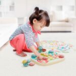 Jeu en bioplastique dédié aux plus petits. Équipé avec des boutons aux grandes dimensions à encastrer pour développer la motricité fine et la coordination œil-main.