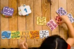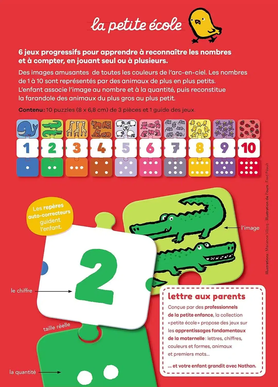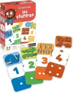 Un jeu d’association pour apprendre les chiffres de 1 à 10. L’enfant associe l’image (« deux crocodiles ») avec le chiffre (« Deux ») et les points correspondants (« deux points »). C’est simple et les trois cartes sont de la même couleur! Il peut également les classer du plus petit au plus grand.